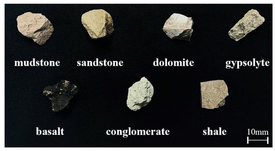 The experimental samples are shown in Figure 3 and provided by the logging branch of Sinopec Zhongyuan Petroleum Engineering Co., Ltd. (Puyang, China). They were rock block samples collected from oil logging sites across China. Professional geological engineers have determined the types of rocks to which these samples belong (mudstone, basalt, dolomite, sandstone, conglomerate, gypsolyte, and shale). A total of 70 samples were collected, with ten blocks of each rock type.