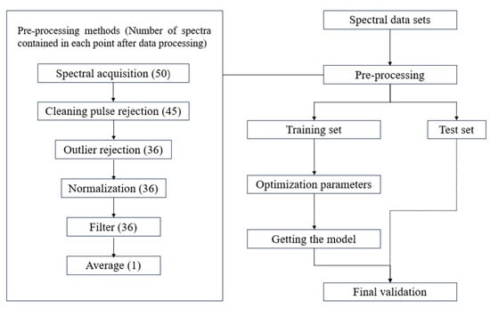As shown in Figure 5, the spectral data obtained underwent several pre-processing steps, including cleaning pulse rejection, outlier rejection, spectral area normalization, and Savitzky–Golay filtering, followed by averaging to enhance the signal quality. The averaged spectra from each area point served as representative spectra, leading to a total of 350 representative spectra for analysis.