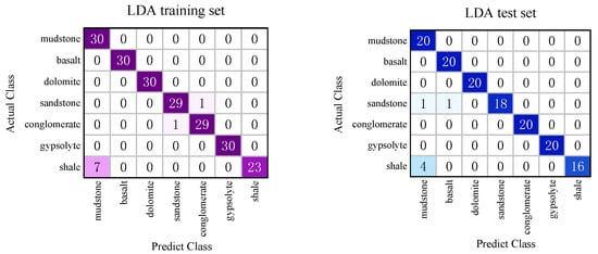 The confusion matrices for the test and training sets of the LDA model are presented in Figure 11. The horizontal axis labels indicate the number of sample points predicted, while the vertical axis represents the actual number of sample points. Blue squares correspond to the test set results, and purple squares represent the training set results. The color intensity of the squares is linearly related to the value size, and darker squares indicate larger values. In this LDA analysis, 24 PCs were used, with singular value decomposition applied and the parameter n_components set to 1. The accuracy of the LDA model was 95.71% for both the training and test sets. Within the test set, the LDA model achieved optimal predictions for dolomite, gypsolyte, and conglomerate, each receiving an F1 score of 1 (refer to Table 1 for statistical details). The recall rate was 1 for all categories, except sandstone and shale. Specifically, two sample points from sandstone were incorrectly classified as basalt and mudstone, respectively. Additionally, all four shale points were misidentified as mudstone, resulting in mudstone exhibiting the lowest precision at 0.8. Similar patterns were observed in the LDA training set results.