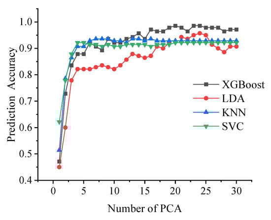As shown in Figure 15, the prediction accuracy of all four models increased significantly with the number of PC up to 5 PCs, indicating that these initial 5 PCs captured most of the relevant data feature information. Beyond 5 PCs, KNN and SVC models showed little change in prediction accuracy, suggesting that their classification relied primarily on the feature differences represented by the first 5 PCs. This phenomenon was closely related to the fundamental principles of algorithm design, making it easier for misjudgments to occur in light of the overlapping feature distributions of mudstone, shale, and sandstone presented the Figure 9. In contrast, both XGBoost and LDA continued to improve in accuracy after 5 PCs, with XGBoost outperforming LDA, SVC, and KNN. The XGBoost algorithm effectively captured subtle feature differences in the data. Given the challenges posed by the undesirable main feature distributions resulting from inhomogeneous original samples, XGBoost achieved more accurate discriminant analysis.
