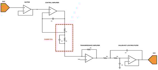 Schematic overview of electronic interface for electrochemical cell. Different stages are shown: control amplifier, electrochemical cell, transimpedance amplifier, active low pass filter (Sallen key).