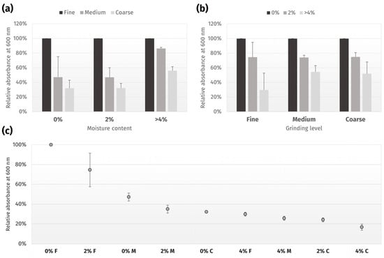 Relative Absorbance at 600 nm, considering the samples divided into sub-groups having the same moisture content, but different levels of grinding (a) and the same degree of grinding but different moisture content (b). In (c) is represented a general overview of the samples, ordered in descending order: 0% F, 2% F, 0% M, 2% M, 0% C, 4% F, 4% M, 2% C, 4% C.