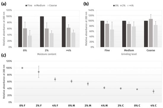 Relative Absorbance at 280nm, considering the samples divided into sub-groups having the same moisture content, but different levels of grinding (a) and the same degree of grinding but different moisture content (b). In (c) is represented a general overview of the samples, ordered in descending order: 0% F, 2% F, 4% F, 0% M, 2% M, 4% M, 2% C, 0% C, 4% C.