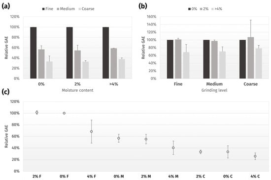 Relative Polyphenols content expressed as Gallic Acid Equivalent (GAE). In (a) are represented the samples divided into sub-categories having the same moisture content but different levels of grinding; in (b) the samples are divided into sub-groups having same level of grinding but different moisture content; in (c) is represented a general overview of the samples, ordered in descending order: 2% F, 0% F, 4% F, 0% M, 2% M, 4% M, 2% C, 0% C, 4% C.
