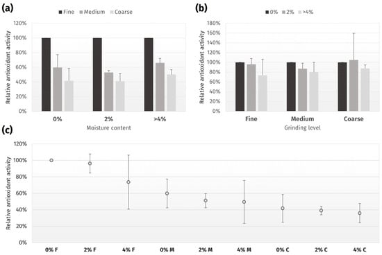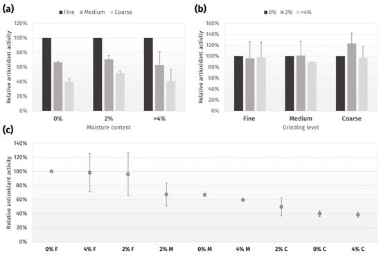 Relative antioxidant activity from DPPH assay. In (a) are represented the samples divided into sub-categories having the same moisture content but different levels of grinding; in (b) the samples are divided into sub-groups having same level of grinding but different moisture content; in (c) is represented a general overview of the samples, ordered in descending order: 0% F, 4% F, 2% F, 2% M, 0% M, 4% M, 2% C, 0% C, 4% C.