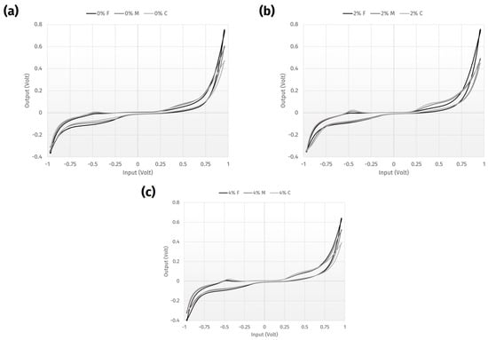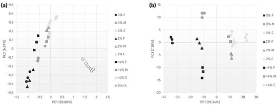 In Figure 8a is shown the scores plot of the first and second components obtained with the PCA model. The PC with the highest information content is PC1 (89.88%). Along this direction, the analyzed samples are grouped into two main distinct clusters: the water cluster (the solvent used in the preparation of the drink) and the coffee. To understand whether the sensor is able to discriminate coffee samples without the presence of the blank, the PCA scores plot for the coffee samples alone was also processed (Figure 8b). Along PC1 (59.34%) it is possible to observe a clusterization of the various coffee samples into three main subgroups: (i) the first group: the most concentrated coffee samples (0% F); (ii) the second group: composed of 0% M, 2% F and >4% F, which are the samples that, in the laboratory analysis, were also usually found to have intermediate values; (iii) the third group: composed of the most diluted coffee samples (0% C, 2% M, 2% C, >4% M and >4% C). The arrangement of the subgroups in the scores plot shows how these samples are distributed according to decreasing solute concentration, thus, from the coffee with the highest solute content (0% F) to the most diluted coffee (>4% C). This is coherent with the fact that the coffee samples are discriminated as high quality samples and lower quality samples. The higher solute content indicates a correct extraction during beverage preparation and, as a consequence, the organoleptic properties will also be more evident. The results obtained from the application of the sensor agree with those obtained from the laboratory analysis and confirm the electrochemical sensor’s capability to discriminate qualitatively between different coffee samples.
