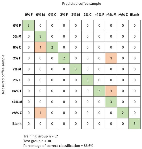 Confusion matrix of the PLS-DA model used for prediction of tested samples; green and red cells represent correct and incorrect predictions, respectively. The model has been trained on a group of 57 samples, while the test consists of a group of 30 samples.