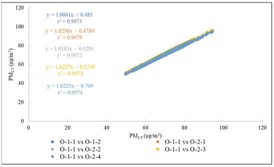 As shown in Table 3, MNE results were less than 2.1%, and RMSE results were less than 1.5. This suggests that the PM2.5 concentrations obtained from the other five OPCs were close to O-1-1. MNB results ≤ 2.1% indicated the PM2.5 concentrations obtained from other OPCs were slightly higher than those obtained from O-1-1. While devices of the same model can sometimes exhibit substantial differences, these results suggest that these six OPCs perform consistently with minimal inter-device variability.