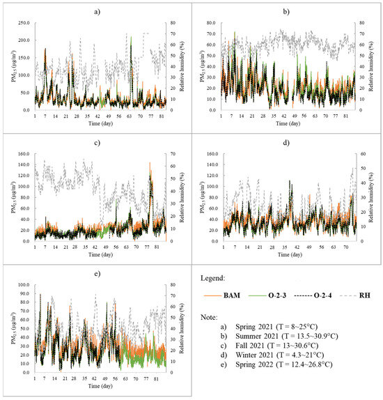 The experiment was conducted for a duration of 15 months, during which continuous measurements of PM2.5 were obtained. Every day, there was no data from around 1:00 to 2:00 a.m. because electricity was shut down to clean the station. Because of electrical issues, the O-2-3 was turned off during 28~31 May 2021; the BAM was turned off during 21~23 July and 16~28 September 2021; the O-2-2 was turned off during 17 February~11 March 2022; and O-2-4 was turned off in May 2022. To provide a broader context and comparative analysis, ambient PM10 and PM2.5 data were also obtained from the national monitoring system operated by the Korea Environment Corporation (Incheon, Republic of Korea) (2021) [71]. These data were used to assess and compare the patterns of PM levels between the subway indoor air and ambient environment because this station has screen doors, which can help reduce the effect of PM emitted from the subway tunnel [26]. The distance between the ambient monitoring station and subway station was approximately 500 m. By implementing this experimental setup and incorporating both indoor and outdoor monitoring data, the present study aimed to gain insights into the levels and distribution of PM2.5 within the subway station environment and examine how they relate to external atmospheric conditions. This factor might affect OPC performance because OPCs generally show good performance in ambient air [33].