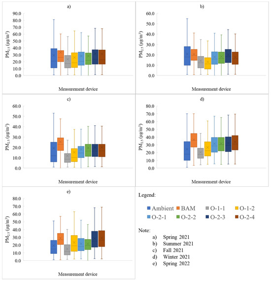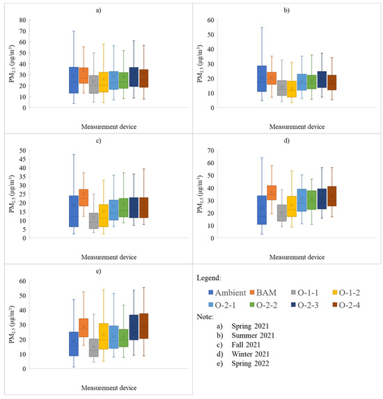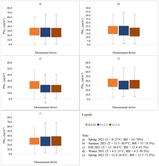 Because BAMs can usually measure and report at least 1-h average PM, 1-h average data were first compared. Figure 6 shows the variation in 1-h average PM2.5 concentrations as measured by the BAM and two OPCs on the platforms over a 15-month period. To provide a comprehensive comparison of the PM2.5 levels, a box and whisker plot (Figure 7) was utilized, showing the mean, median, minimum, and maximum PM2.5 concentrations for each season.