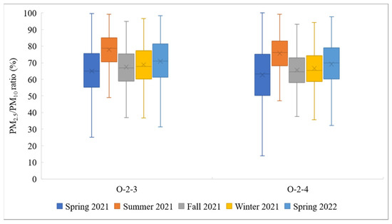 Variation of PM2.5/PM10 ratios based on 24-h average PM values observed from O-2-3 and O-2-4. Note: × is average value.