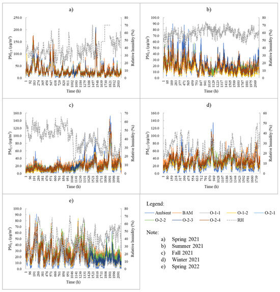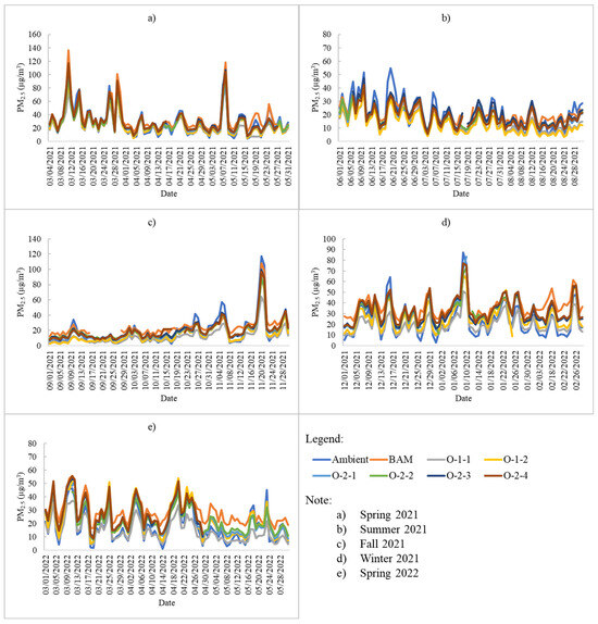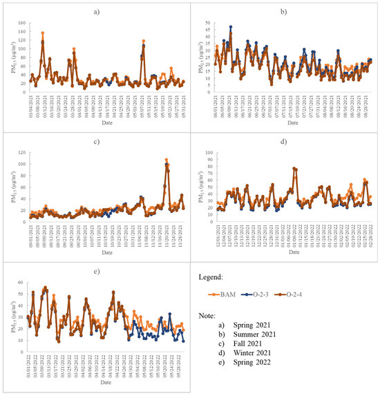 In addition, the relative percentage difference between an OPC and the BAM was also calculated based on Equation (4) to relatively compare the performance of the OPC by season: