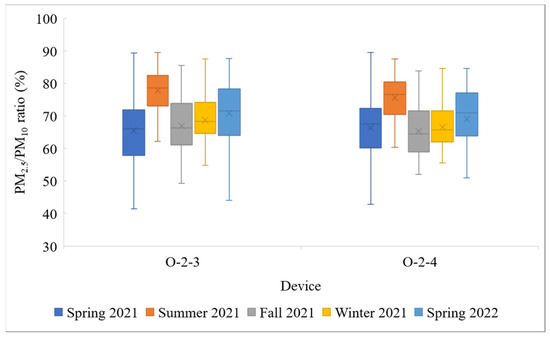Figure 8 shows the notable variations in the PM2.5/PM10 ratios across different seasons. The majority of the observed ratios fell within the range of 50% to 80%, with the exception of the summer season, which exhibited ratios between 70% and 90%. Therefore, for the purpose of the data analysis in Table 6, any PM2.5/PM10 ratios below 40% and above 90% were excluded. A closer examination of Table 6 indicates a strong correlation between the BAM and OPC measurements when the PM2.5/PM10 ratios were below 60% or above 70% and more frequency occurred at over 70%. Furthermore, as shown in Table S2 (Supplementary Materials), PM2.5 concentrations obtained from the two OPCs showed a stronger correlation with those from the BAM when the fine particle mass was at least twice as high as the coarse particle mass. This finding emphasizes the dependency of OPC accuracy on particle size because the OPC measurements aligned more closely with BAM measurements under specific PM2.5/PM10 ratio conditions. The observed correlation suggests that OPCs may provide accurate measurements for particle sizes falling within these ranges, further reinforcing the importance of considering particle size dynamics in assessing the performance of OPCs. This trend could also explain why the relationship between O-2-3 and O-2-4 was different in summer compared with other seasons. In addition, the varying correlation coefficients among seasons within the same PM2.5/PM10 ratio range, as demonstrated in Table 5, once again highlighted the impact of seasons on the performance of mid-cost OPCs.