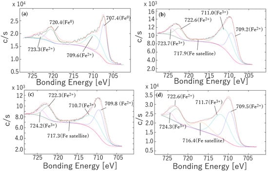 Fe 2p XPS spectra obtained from passivation films formed on SUS316L specimens after (a) polishing and following annealing at (b) 400 °C for 1 h, (c) 400 °C for 5 h or (d) 500 °C for 1 h. The red and black spectra are the fitted data and the original experimental data.