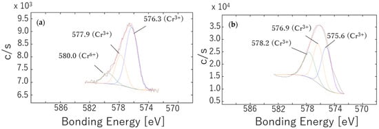 Only the specimens annealed at 500 and 800 °C provided Cr peaks that were sufficiently intense for analysis. In both cases, the Cr on the specimen surface was almost completely oxidized because no peak corresponding to metallic Cr0 (at approximately 574 eV) was detected (Figure 3) [39,40]. The oxidized Cr species were identified as Cr2O3 (at 576 and 578 eV), CrOOH (at 577 eV) and CrO3 (at 580 eV) [34,35,37]. Calculations based on peak areas showed that 32% of the Cr was present as CrO3 in the sample annealed at 500 °C, suggesting the formation of a highly oxidized passivation film. In contrast, the sample annealed at 800 °C did not produce a clear peak near 580 eV but instead provided a peak at approximately 577 eV that was attributed to chromium hydroxide. Given the annealing conditions, it is unlikely that this compound was formed during the annealing process. However, considering the surface characteristics of the sample annealed at 800 °C (Figure 1), it is possible that annealing facilitated the reaction of the metal with moisture such that chromium hydroxide was produced during the slow cooling step.