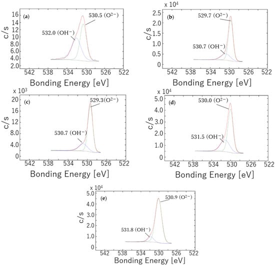The O 1 s spectra in Figure 4 contain peaks at approximately 530.0 and 531.5 eV corresponding to O2− and OH− but no detectable peak associated with H2O at 533.0 eV [34,37]. The O2−/OH− ratio calculated from peak areas was 1.08 for the polished sample, indicating that approximately half of the passivation film consisted of hydroxides. In contrast, the specimens annealed at 400 and 500 °C exhibited ratios ranging from 2.06 to 3.23 while the 800 °C sample had a ratio of 9.40. Evidently, annealing reduced the hydroxide content in the passivation film, with this effect becoming more pronounced at higher annealing temperatures. Nevertheless, the OH− peak intensity observed in Figure 4e was comparable to or even higher than those provided by the other materials, suggesting that hydroxide could not be completely removed. It is also apparent that hydroxide formation during the post-annealing cooling process was unavoidable.