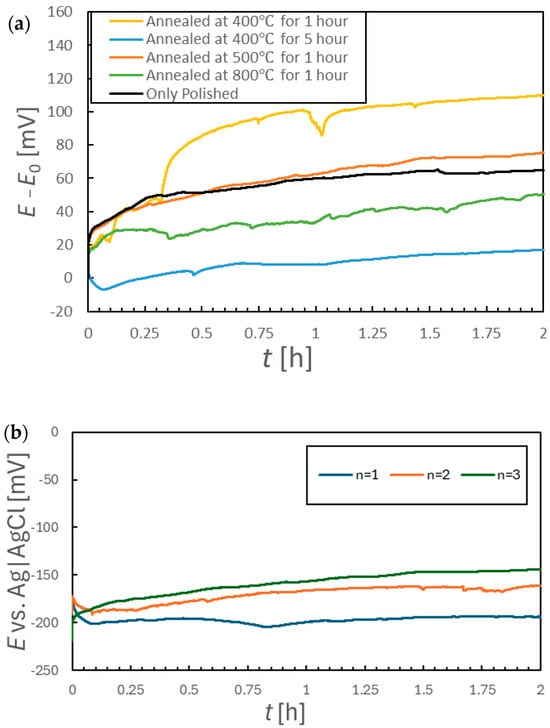 The stability of the potentials generated by the SUS316L specimens was assessed by monitoring the OCP data for 2 h immediately after immersion in simulated tap water, with the results shown in Figure 5. Figure 5a shows the potential difference, E − E0, where E is the OCP value at a specific point in time and the E0 is the OCP at the point of immersion. Note that each measurement was repeated three times for each condition to assess reproducibility. The data for the sample annealed at 500 °C are shown in Figure 5b as an example of the reproducibility of data between replicate trials. Similar trends were observed for the other samples. The E0 for each sample shown in Figure 5a are also provided in Table 3. The data in Figure 5a confirm that the OCP increased over the first 2 h of each trial for all samples, although the extent of this increase varied significantly depending on the annealing temperature. The sample annealed at 400 °C for 1 h exhibited especially poor potential stability compared with the polished specimen, based on the larger increase in potential for the former. Samples annealed under other conditions showed comparable or smaller increases in OCP relative to the polished sample. However, while the sample annealed at 800 °C exhibited a relatively modest increase of approximately 40 mV over 2 h, the potential values did not increase monotonically over time but rather fluctuated erratically. Therefore, it is difficult to draw firm conclusions based solely on these 2 h OCP profiles.
