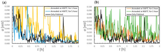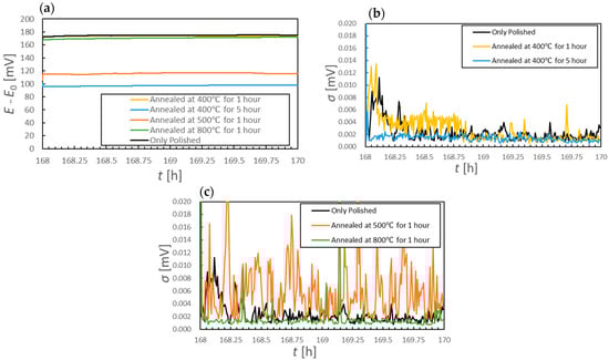 Following 168 to 170 h of immersion, all samples exhibited potential drifts of less than 1 mV/h (Figure 8a). This outcome suggests that the SS specimens had each reached a steady-state condition in which the passivation film was maintained in a stable manner. The polished sample and the samples annealed at 400 and 800 °C for 1 h all showed significant increases in potential after one week of immersion. However, the increase for the sample annealed at 400 °C for 1 h was 24 mV relative to that at the 26 h mark, whereas the increase for the 800 °C specimen exceeded 71 mV over the same period. The samples annealed at 400 °C for 5 h and at 500 °C for 1 h showed particularly small total potential increases from the start of immersion, with increases of 28.3 and 36.9 mV, respectively, after the 26 h mark. All materials except that heated at 500 °C provided standard deviations above 5 μV for 49% of a 2 h time span, whereas the specimen annealed at 400 °C for 5 h maintained standard deviations at or below 5 μV for 99% of this duration.