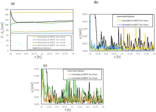 To assess short-term potential stability more quantitatively, the OCP data acquired over 2 h durations were divided into 30 s intervals and the standard deviation (σ) was calculated for each such interval. The results are shown in Figure 6. This analysis revealed that the sample annealed at 800 °C produced consistently high σ values throughout the 2 h period, indicating unstable short-term potential behavior (Figure 6b, green curve). In contrast, the samples annealed at 400 °C for 5 h and at 500 °C for 1 h showed smaller standard deviations than the other specimens. Thus, this analysis established that these particular electrodes provided more stable OCP values. The OCP data acquired following immersion for 24 h are presented in Figure 7a, while the standard deviation values calculated using the same 30 s interval method are shown in Figure 7b,c. Comparing Figure 5a and Figure 7a, it can be seen that the polished sample and the sample annealed at 800 °C both exhibited OCP increases exceeding 100 mV over 26 h. In contrast, the samples annealed at 400 °C for 5 h and at 500 °C for 1 h showed smaller increases of approximately 70 mV. Notably, the 500 °C specimen produced an increase of only approximately 10 mV between the 2 and 26 h marks, indicating that the major potential change had occurred within the first 2 h of immersion. The potential drift calculated between 24 and 26 h was less than 1 mV/h for the polished sample and the samples annealed at 400 °C, whereas values of 2.7 and 1.3 mV/h were obtained for the materials processed at 500 and 800 °C, respectively. As shown in Figure 7b, the standard deviations for the samples annealed at 400 °C were lower than those of the polished sample, regardless of the annealing duration. However, the specimens heated at or above 500 °C exhibited larger standard deviations than the polished sample, demonstrating increased short-term potential fluctuations as a result of annealing.