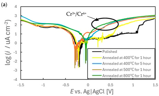 Figure 9 presents polarization curves acquired from SUS316L specimens in simulated tap water. The results clearly indicate that the electrochemical behaviors in these dilute solutions varied significantly depending on the annealing conditions. In particular, the extent of the passive region was affected, such that this region became smaller with increases in the annealing temperature and annealing time. The passivation film on the polished sample was evidently stable because a low current density of approximately 10 µA/cm2 was maintained up to +1.0 V (vs. Ag|AgCl). In contrast, the sample annealed at 400 °C for 1 h provided a passivation region only up to +0.5 V and no distinct passive region was produced by the sample annealed at 800 °C. The specimens annealed at or above 500 °C showed a marked increase in current density starting at approximately +0.3 V (vs. Ag|AgCl). The oxidation of Cr from Cr3+ to Cr6+ is known to occur at the potential (around 0.3 V) [41]. Given that both the EDS and XPS analyses confirmed the presence of Cr on the surfaces of these samples, it is reasonable to conclude that some residual Cr underwent further oxidation during the polarization tests. It is also notable that the anodic polarization curve produced by the sample annealed at 400 °C for 1 h contained numerous current spikes between the open-circuit potential and +550 mV. This behavior suggests that the sample was particularly susceptible to pitting corrosion in the early stages of immersion, which may account for the unstable potential behavior observed in Figure 5a. The presence of pitting is also evident in the SEM images in Figure S2b, which show numerous dark spots on the surface of the same sample. From these findings it is apparent that the surface condition resulting from short-term annealing at 400 °C rendered the SUS316L more vulnerable to localized corrosion, which in turn contributed to the unstable early-stage electrochemical behavior.