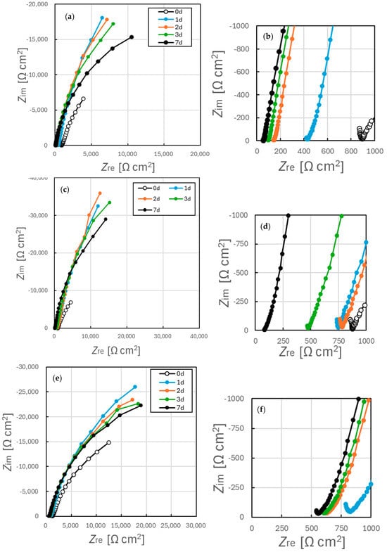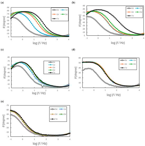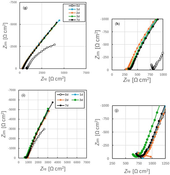 Figure 10 shows a marked decrease in impedance within the high-frequency region for samples (a) and (b), with little to no change for the other samples over time. The electrical conductivity of the test solution was found to increase from 14 mS/m (σ = 6 mS/m) immediately after preparation to 101 mS/m (σ = 17 mS/m) after 7 d. Although this change indicates a measurable variation in solution conductivity, the corresponding change in resistance was approximately 30 Ω cm2 and so was insufficient to explain the observed impedance decrease of greater than 500 Ω cm2. Therefore, the changes in the real part of the impedance, Z_re, observed in the high-frequency region can be interpreted as reflecting changes in the surface film formed on the SS specimens. It has been reported that the passivation film on SS possesses a bilayer structure [38,47,48,49], in which the outer layer is relatively loose and makes a minimal contribution to corrosion resistance [38,49]. This outer layer can interact with the ohmic resistance and strongly affects the high-frequency response during impedance measurements. Consequently, the present results can also be attributed to modification of the outer layer of the passivation film. Such modifications could explain the time-dependent changes observed in the high-frequency region of the Nyquist plots.