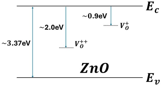 Figure 1. Energy band gap of ZnO with energy levels of oxygen vacancies V O + and V O + + .