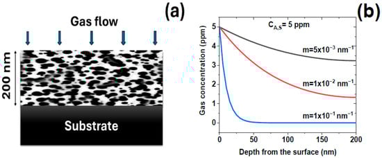 Figure 2. (a) Schematic illustration of a porous thin film exposed to gas flow. (b) Simulated Gas diffusion profile across sensing layer depth at different m values.