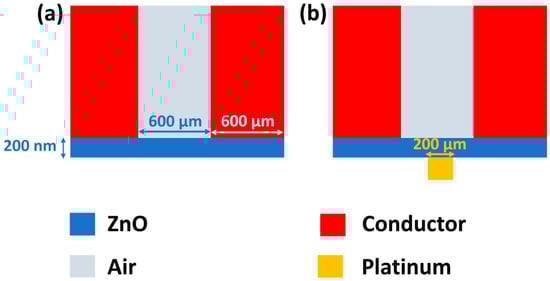 Figure 3a,b show the device architectures of the conventional resistive gas sensor and the FGFET-based gas sensor, respectively. Both configurations use a 200 nm-thick n-type ZnO sensing layer, with an intrinsic charge carrier concentration of 5 × 1017 cm−3. The two sensor structures share a common layout featuring a pair of top-deposited ohmic contacts, each 1 µm thick and 600 nm wide, spaced 600 nm apart on the ZnO surface.