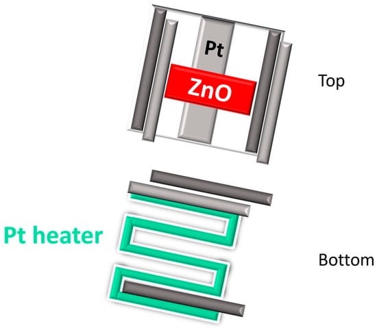 The FGFET and resistive gas sensor structures were fabricated following the simulation designs. Alumina (Al2O3) substrates (2 mm × 2 mm, 2N purity, Kyocera, Japan) were first cleaned ultrasonically in acetone for 20 min, rinsed with ethanol, and dried in synthetic air. For the FGFET structure, a 100 nm-thick Pt layer was deposited on the alumina substrate as a gate Schottky contact using DC magnetron sputtering. A 200 nm-thick Zn layer was then deposited on both sensor structures using the same method. The samples are oxidized at 500 °C for 1 h under a partial vacuum of 0.7 mbar, with a gas flow of 20 sccm O2 and 80 sccm Ar, resulting in the formation of nanoporous ZnO material. To form the ohmic electrodes, a 50 nm TiW layer followed by 1 µm of Pt was deposited using DC magnetron sputtering at 300 °C, ensuring strong adhesion to the alumina substrates. The TiW layer provided excellent ohmic contact while enhancing adhesion. On the backside of the samples, a 50 nm TiW adhesion layer is deposited, followed by a 1.5 µm-thick Pt heating element, also using DC magnetron sputtering (see Figure 4).