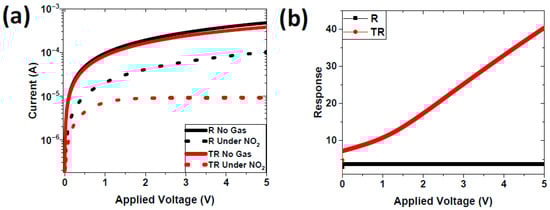 Figure 6. (a) Current versus applied voltage before and after exposure to NO2 and (b) gas sensing response of the resistor and FGFET devices toward NO2.