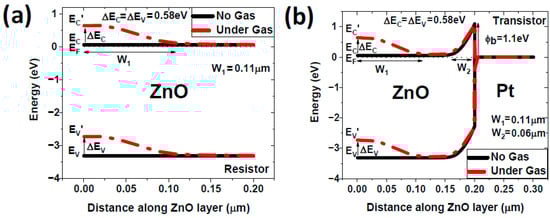 Figure 7. Energy band profile of the (a) resistor- and (b) FGFET-based gas sensors, along the y-axis.