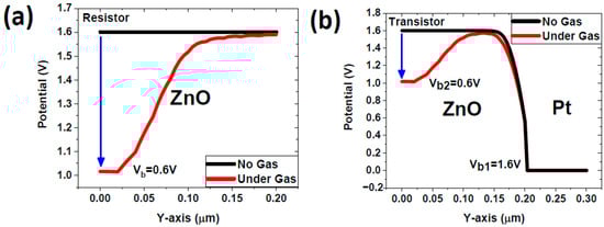 Figure 8. Potential diagram of the resistor (a) and FGFET (b) based gas sensors, along the y-axis. Blue arrows indicate the potential change after gas exposure.