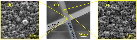 The morphology of the ZnO sensing layers was characterized using a scanning electron microscope (SEM) with high-resolution (MIRA3 FEG-SEM, TESCAN). The images were captured at 7 kV, with a working distance of 10 mm and magnification of 10,000×.