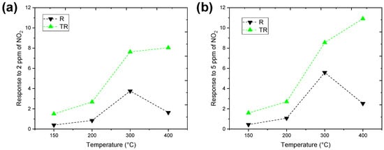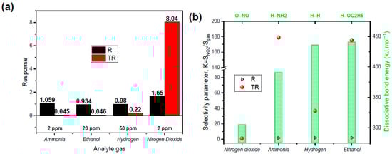 Figure 17. (a) Gas response of the ZnO sensor at 400 °C and 40% RH. Responses were recorded at the concentrations indicated in the legend. (b) Selectivity factor, defined as the response to each gas normalized to the response to NO2. Empty triangles correspond to the R sensor, while red circles represent the TR sensor. The bond-dissociation energy values for the relevant bonds are represented as green histograms for comparison.