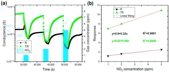 Figure 14. (a) Storage stability performance to 2 ppm NO2 gas at 400 °C and 40% of relative humidity@20 °C. (b) Baseline conductance evolution of the sensors over 37 measurement days.