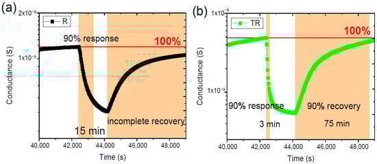 Figure 12. Dynamic response to 2 ppm NO2 gas at 400 °C and 40% of relative humidity@20 °C for (a) resistor and (b) transistor devices.
