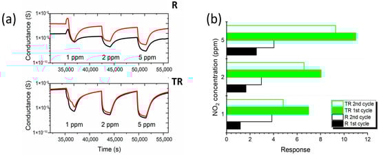 Figure 13. (a) Repeatability performance to NO2 gas at 400 °C and 40% of relative humidity@20 °C: cycle 1 (black line) and cycle 2 (red line). (b) Histogram representation of sensitivity extracted from (a): filled rectangles and empty rectangles describe the first and second cycles, respectively.