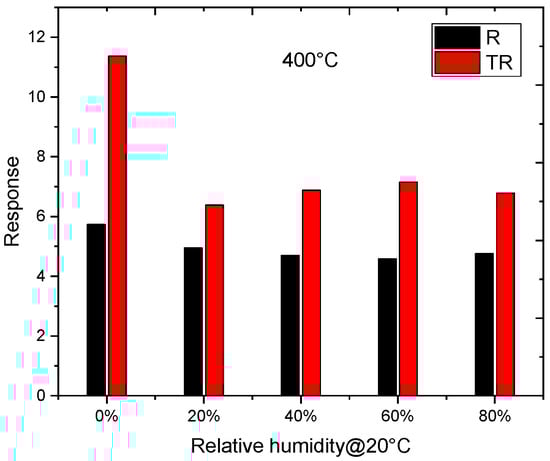 Figure 15. Response dependency on relative humidity levels at 400 °C, under exposure to 2 ppm NO2.