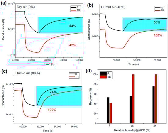 Figure 16. Dynamic response-recovery curves to 2 ppm in dry (a) and humid (bc) environments with (d) representative histogram of recovery dependency on humidity levels at 400 °C.
