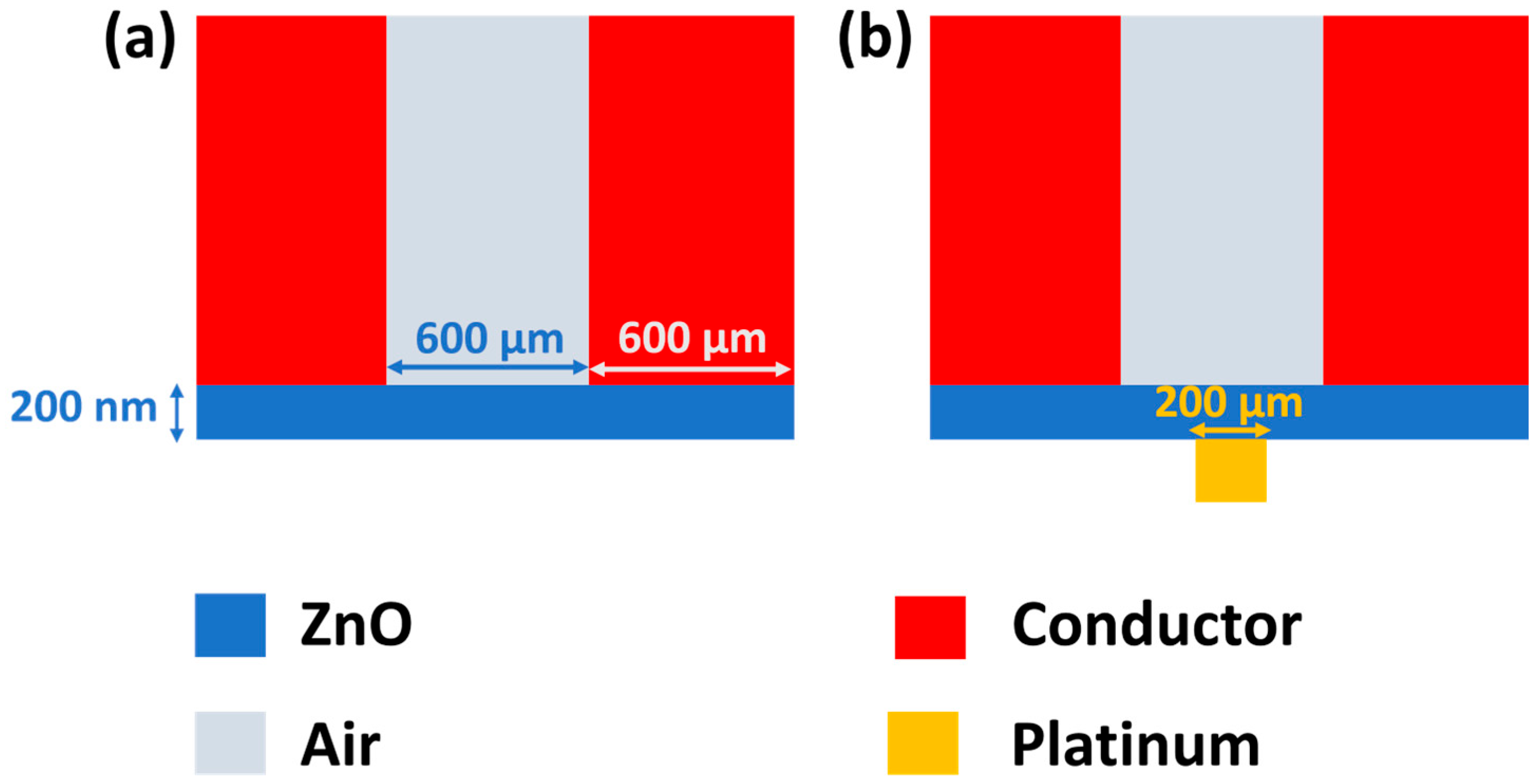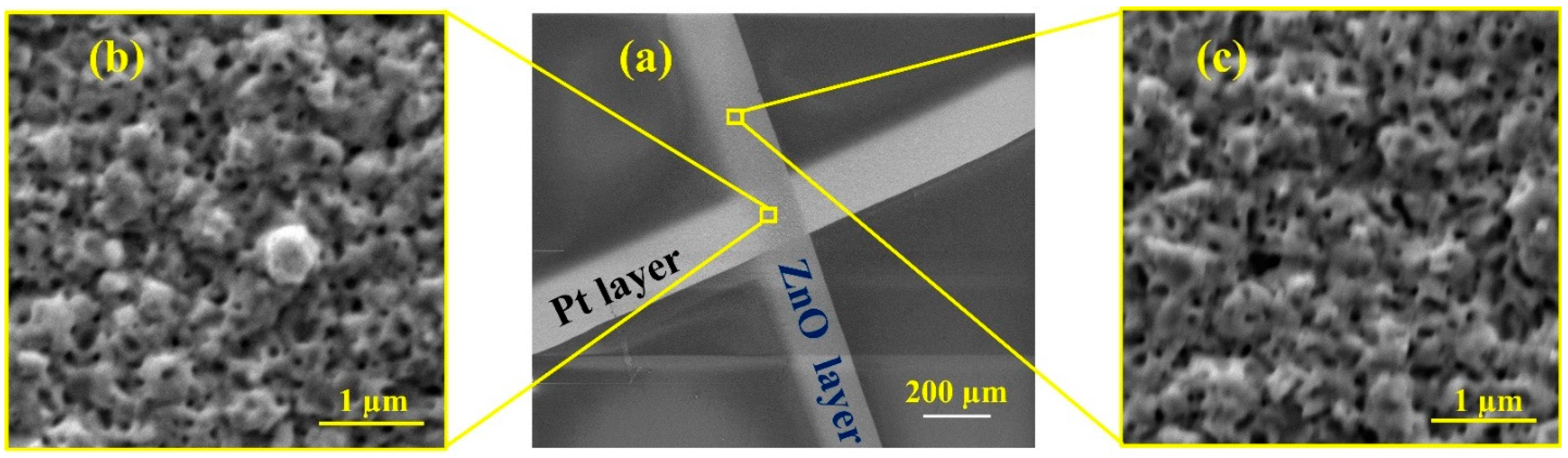 - The remaining two pins were connected to the Pt pads on the top ZnO surface for electrical signal measurement.
