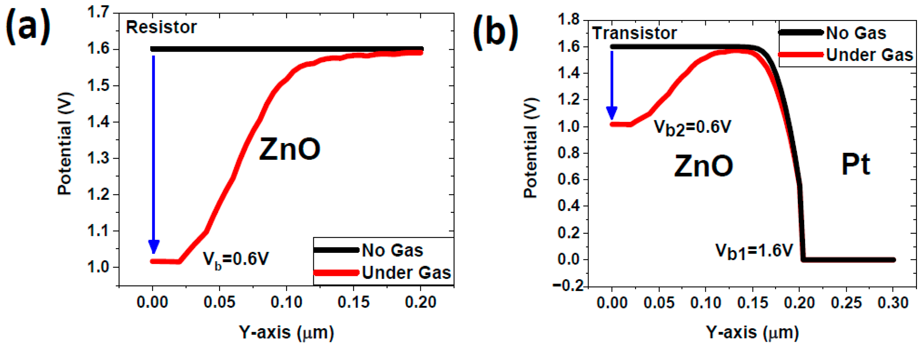 - Additional barrier due to NO2 interaction: Upon the introduction of NO2 gas, the molecules adsorb onto the ZnO surface, leading to an increase in electron depletion and the formation of an additional potential barrier.