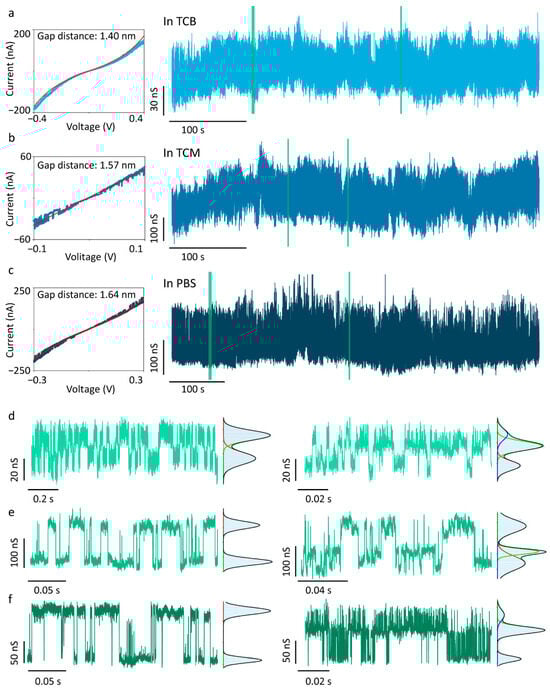 Solvent-independent measurements of the 4-MBA-functionalised QMT probes with a compact nanogap. I–V traces with Simmons tunnelling model fitting and representative conductance trace of QMT probes measured in (a) TCB, (b) TCM, and (c) PBS. (d–f) The enlarged views of conductance traces and corresponding histograms from the green-marked regions in (a–c). The histograms show bimodal or trimodal distributions for selected segments.