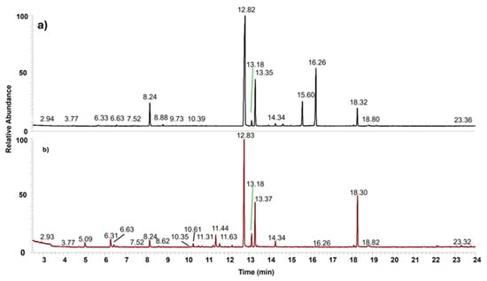 Typical GC-MS chromatogram obtained from Sulmona red garlic clove (a) and scape (b). TIC = 6.35 × 1010 (a) and 1.11 × 1010 (b).