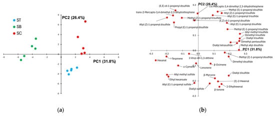 (a) Score plot showing the samples collected from the tip (ST), base (SB) and centre (SC) of the Sulmona Red Garlic scape, projected on the plane of the first two principal components; (b) corresponding loading plot.