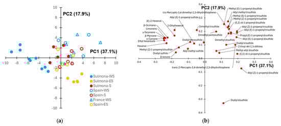PCA was applied to provide a graphical visualization of the data (Figure 3). The score plot (Figure 3a) reveals a good separation of Sulmona Red Garlic samples (full symbols) according to the cultivation site. In particular, the samples cultivated within Sulmona municipality are located around the origin of PC1-PC2 graph, the scapes coming from WS sites can be found at negative PC1 scores and small PC2 scores, while the scapes from ES sites exhibit positive PC1 scores and negative PC2 scores. Based on the related loading plot (Figure 3b), moving from west to east cultivation sites results in a progressive decrease in the content of non sulphur volatile compounds (terpenes and aldehydes, in particular) and a progressive increase in the contribution of organosulphur volatiles to the aroma of scapes. As highlighted by Tukey test (Table A1), the difference in relative abundances between these two groups is also significant for several volatiles.
