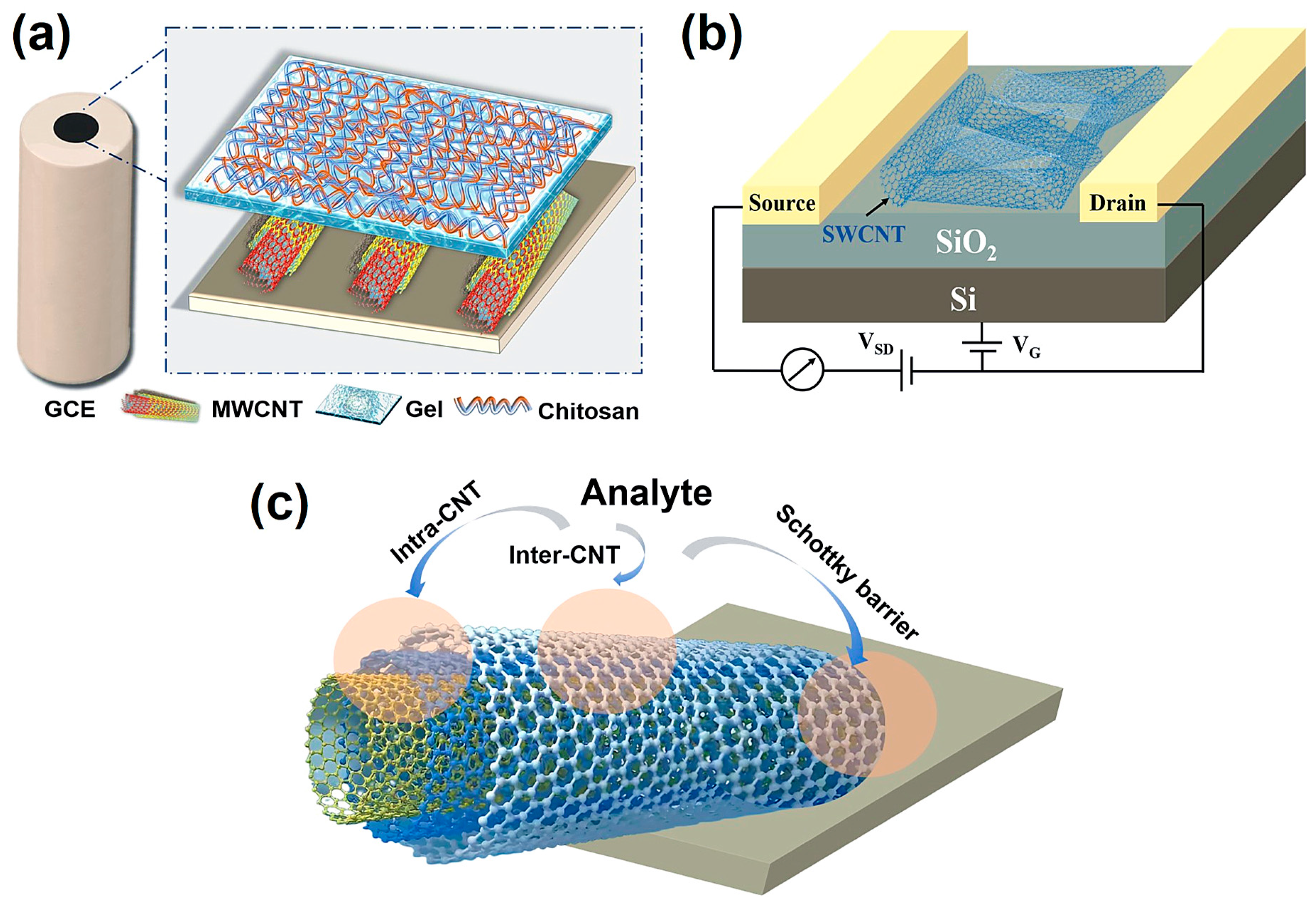 Resistive | Adsorption of analytes alters CNT electrical resistance/conductivity | Gas sensing, small biomolecules (e.g., glucose) | Simple structure, easy fabrication, high sensitivity | Poor selectivity, susceptible to environmental interference |