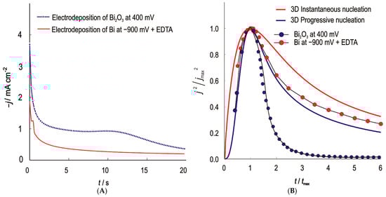 (A)—Current–time (potentiostatic) transients for the nucleation and growth of Bi and Bi2O3 on the GC; (B)—Normalized potentiostatic transients, symbols are experimental values and the lines represent theoretical curves for the 3D instantaneous (red line) and progressive (blue line) type of nucleation and growth under diffusion control.