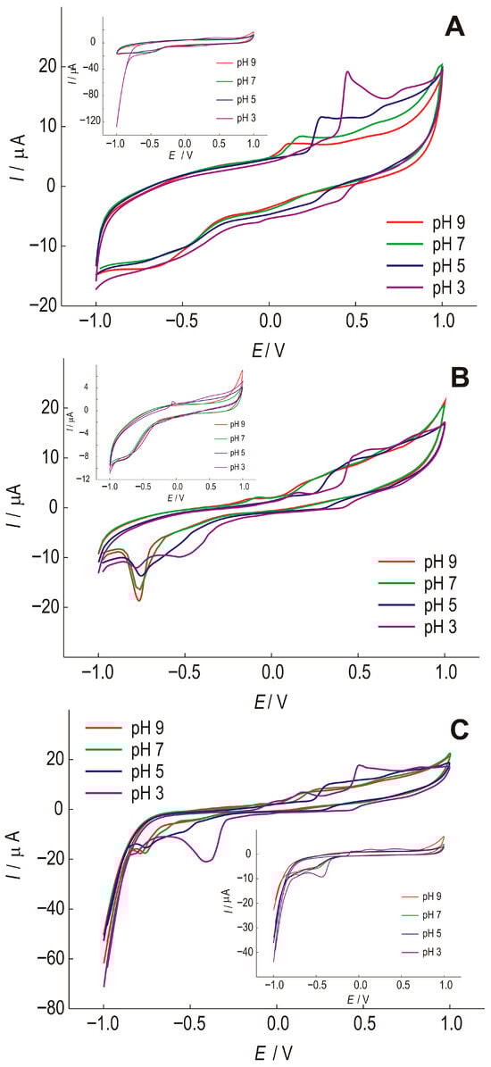 Cyclic voltammograms of (A)—SWCNT; (B)—SWCNT/Bi and (C)—SWCNT/Bi2O3 at different pH of the phosphate electrolyte, with the addition of 1 × 10−4 mol dm−3 of gallic acid, recorded at a scan rate of 25 mV s−1. Insets: response of the corresponding electrodes in the absence of the analyte.