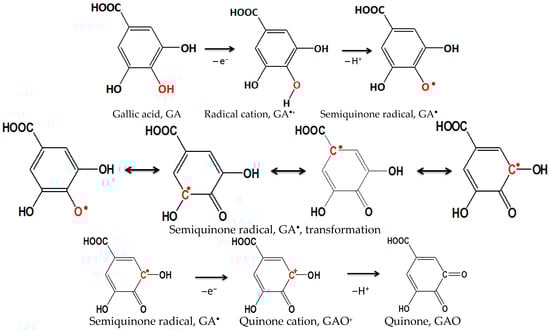 Schematic representation of the oxidation process of gallic acid with the formation of semiquinone radical and quinone.