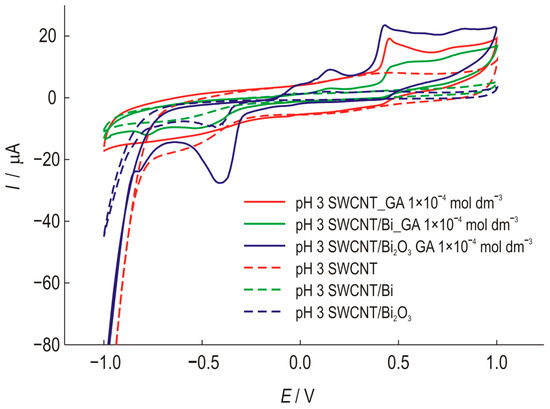Cyclic voltammograms of SWCNT electrodes, unmodified and modified with Bi or Bi2O3, recorded in the presence (1 × 10−4 mol dm−3) and absence of GA at a scan rate of 25 mV s−1, pH 3.